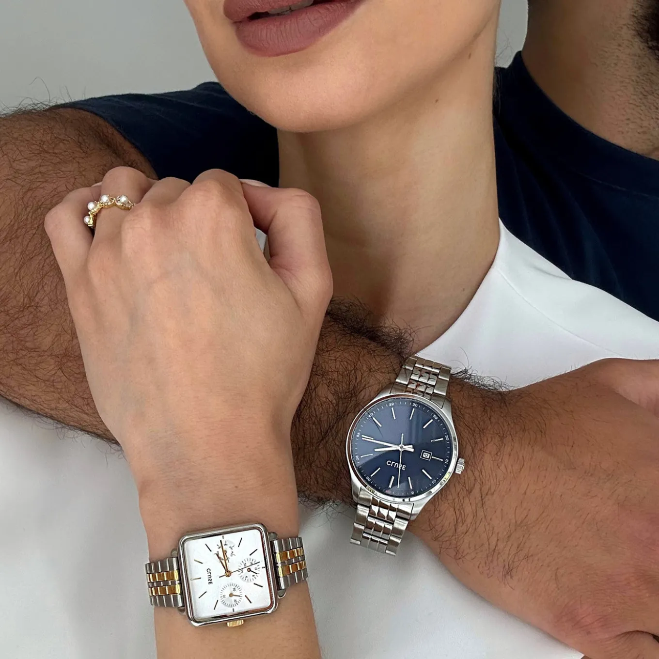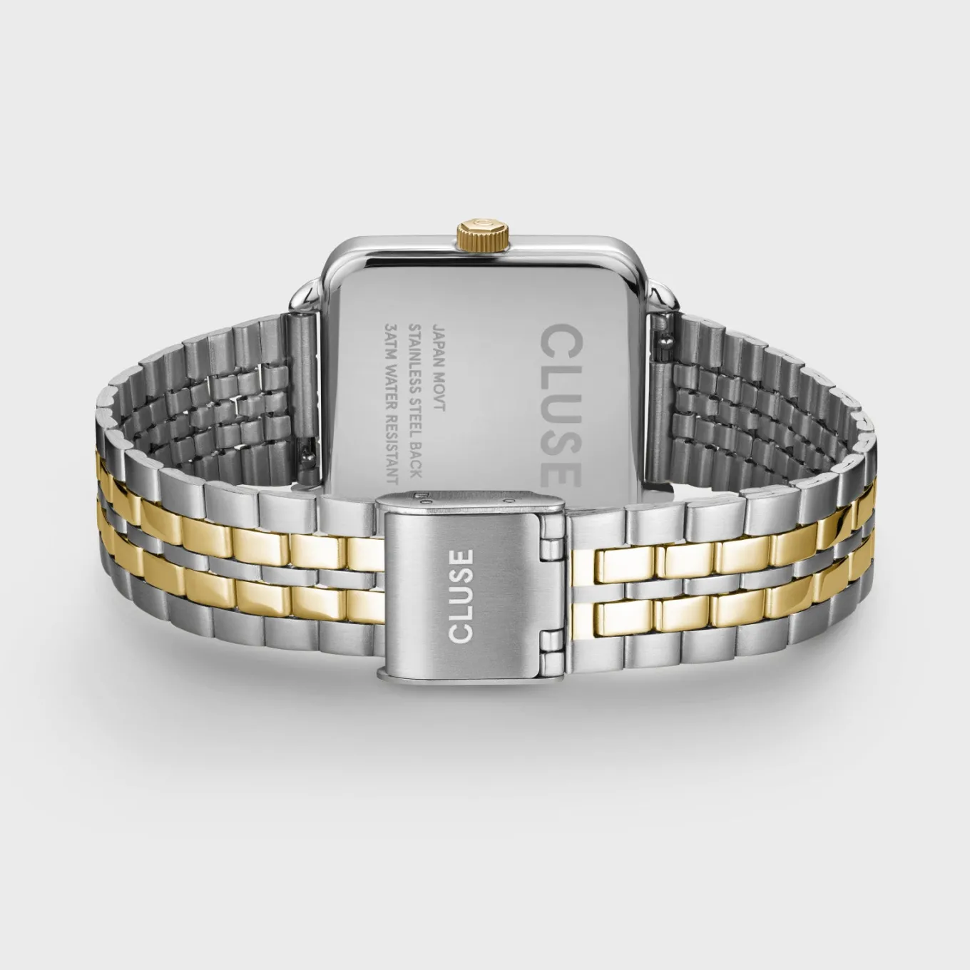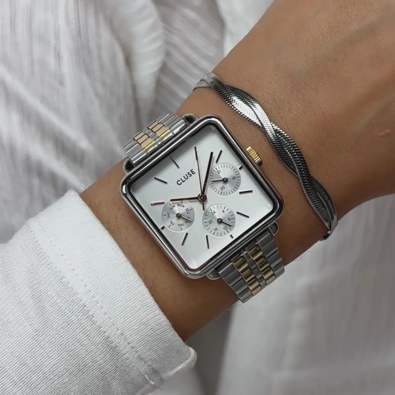 Verleihen Sie Ihrer Alltagsgarderobe ein Gefühl von Luxus und Eleganz mit der Multifunktionsuhr La Tétragone für Damen. Mit einem quadratischen 30-mm-Gehäuse in den Farben Gold und Silber, einem 5-gliedrigen Armband und drei Hilfszifferblättern zur Anzeige von Tag und Uhrzeit wird dieser zweifarbige Zeitmesser nie aus der Mode kommen. Passen Sie das Aussehen Ihrer Uhr ganz einfach mit jedem 16-mm-Uhrenarmband an. Sie können die Größe des Armbands ganz einfach selbst einstellen.