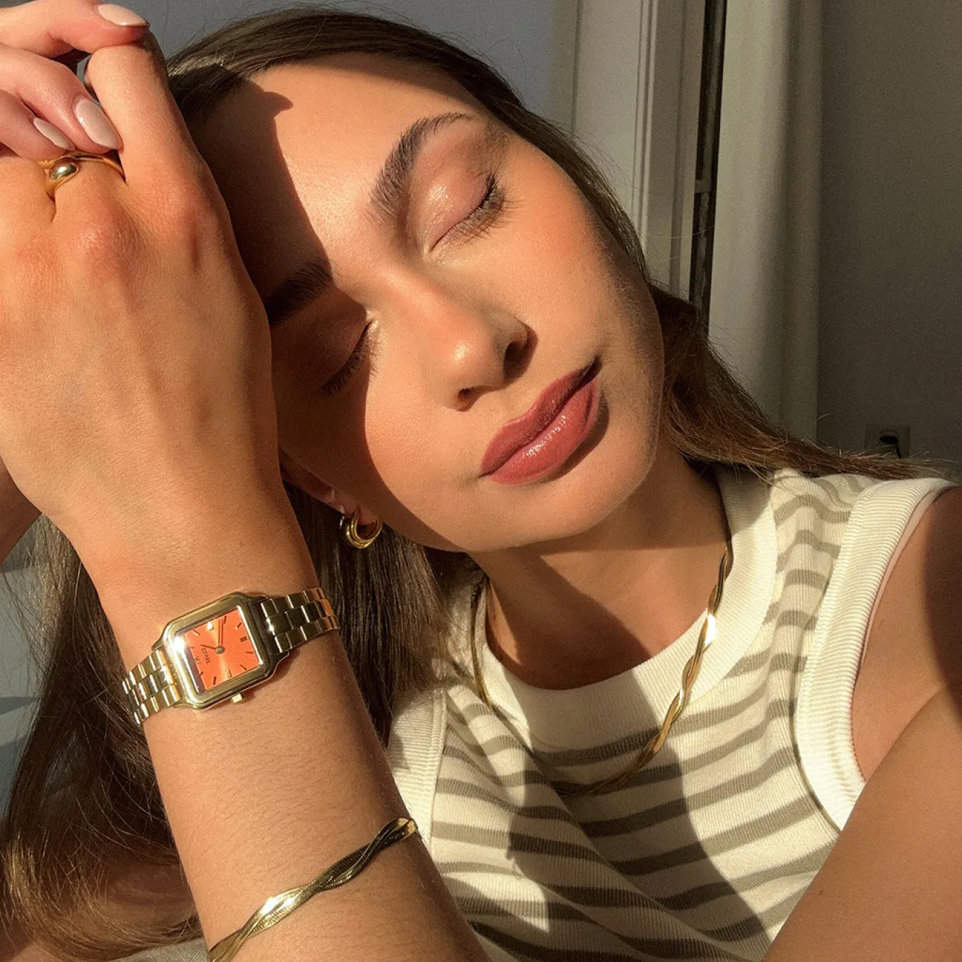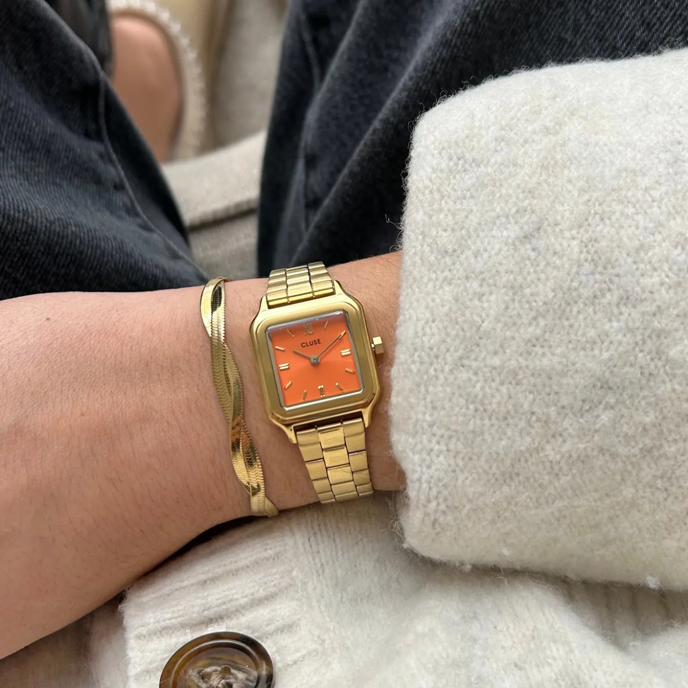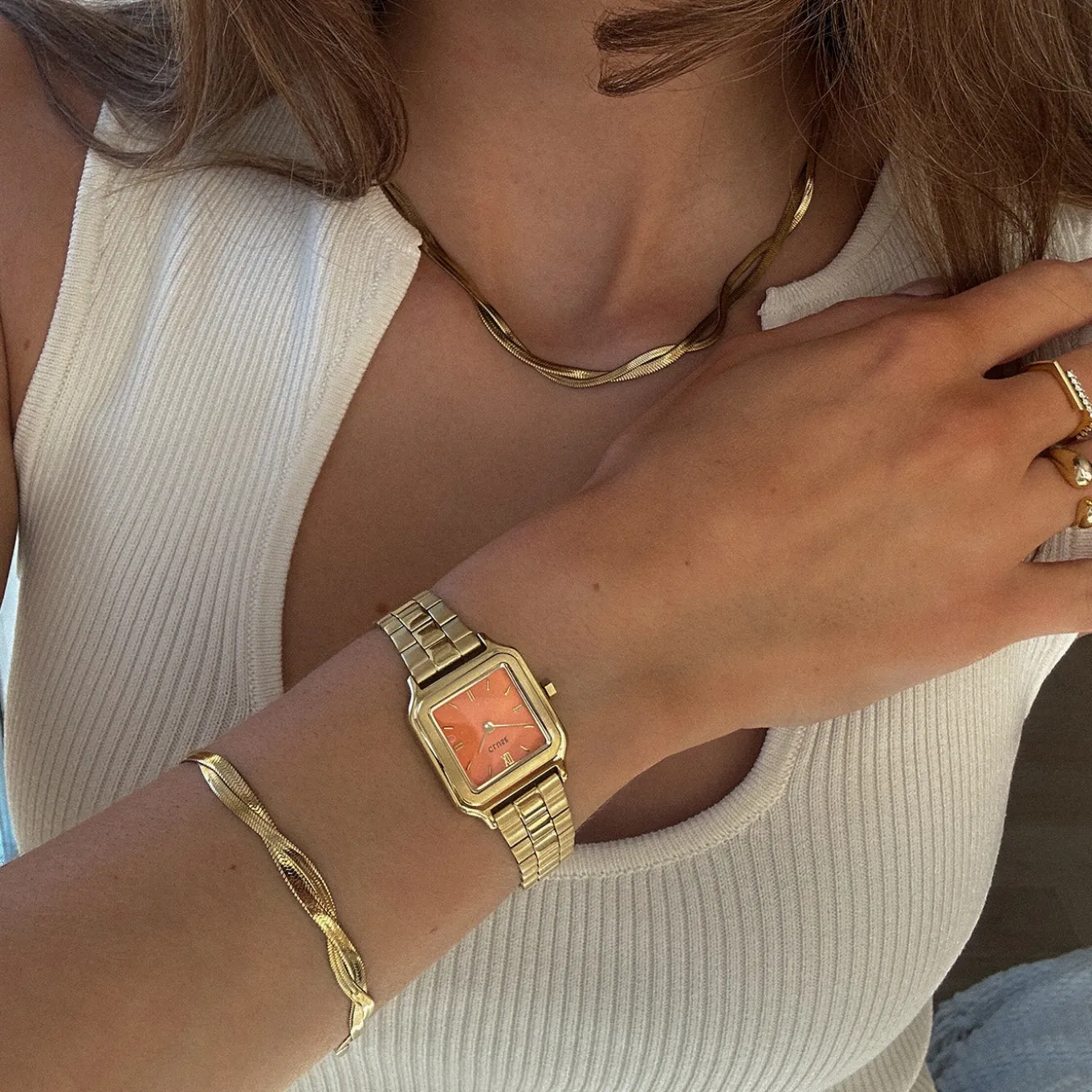 Verleihen Sie Ihrem Look ein Gefühl von Luxus und Raffinesse mit der Gracieuse Petite-Damenuhr. Mit einem quadratischen 24-mm-Goldgehäuse, einem leuchtenden Apricot-farbenen Zifferblatt und einem 14-mm-Edelstahlarmband. Passen Sie das Aussehen Ihrer Uhr ganz einfach mit jedem 14-mm-Uhrenarmband an. Sie können die Größe des Armbandes ganz einfach selbst einstellen.