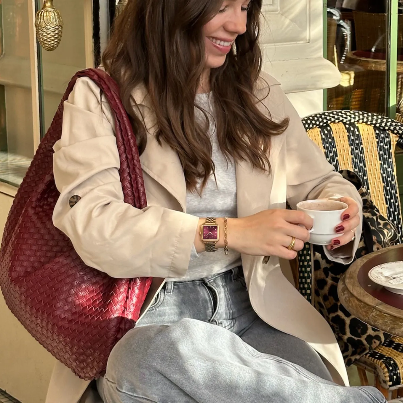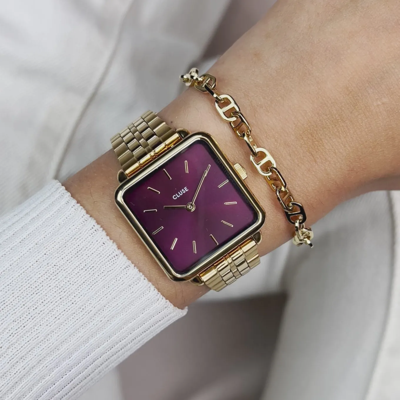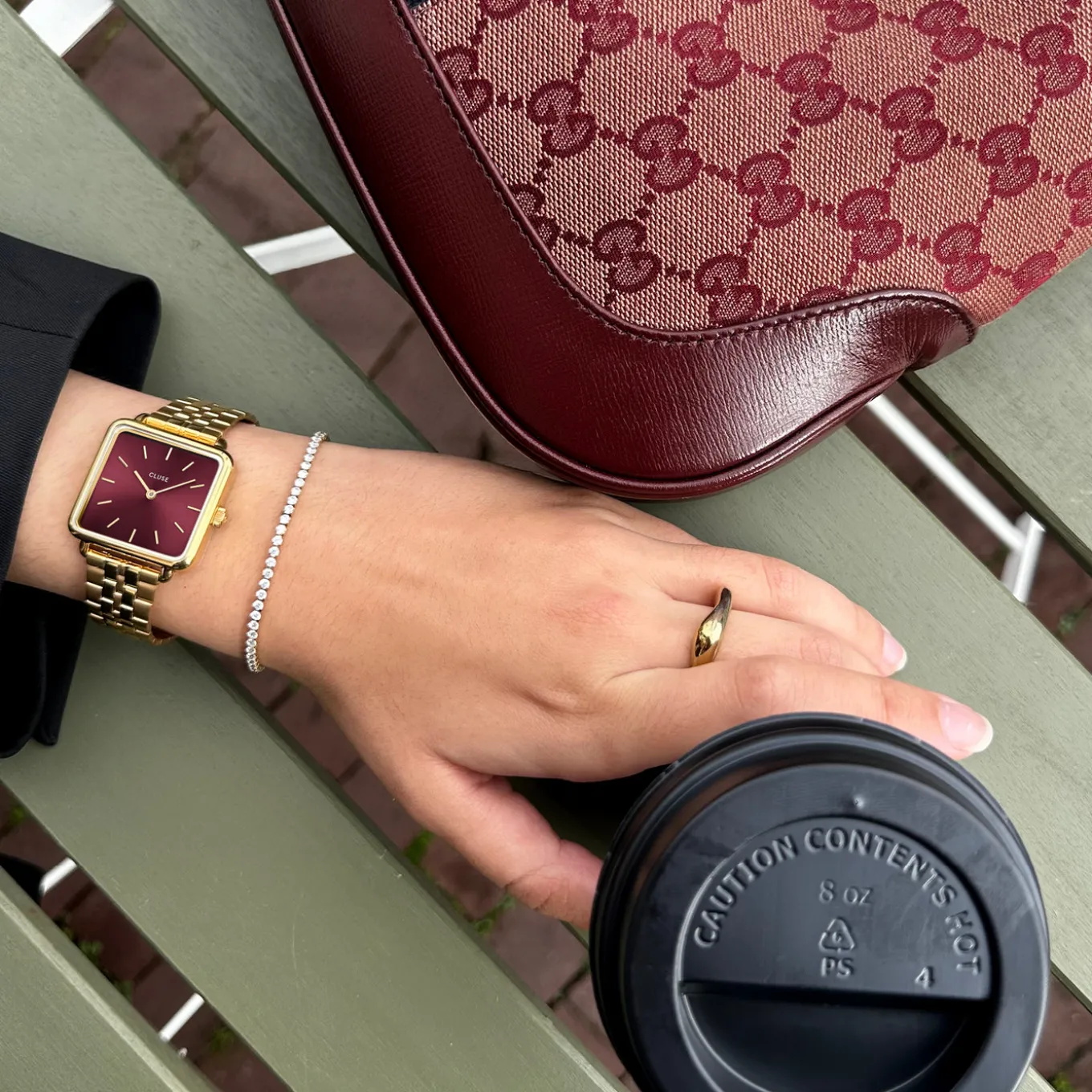 Verleihen Sie Ihrer Alltagsgarderobe mit der Damenuhr La Tétragone einen Hauch von Luxus und Eleganz. Mit einem 28,5 mm großen, quadratischen, goldfarbenen Gehäuse, einem goldenen Armband mit 5 Gliedern und einem kirschroten Zifferblatt. Diese Kombination aus Gold und kräftigen Farben erzeugt einen luxuriösen Look. Passen Sie das Aussehen Ihrer Uhr ganz einfach mit jedem 16-mm-Uhrenarmband an. Sie können die Größe des Armbands ganz einfach selbst einstellen.