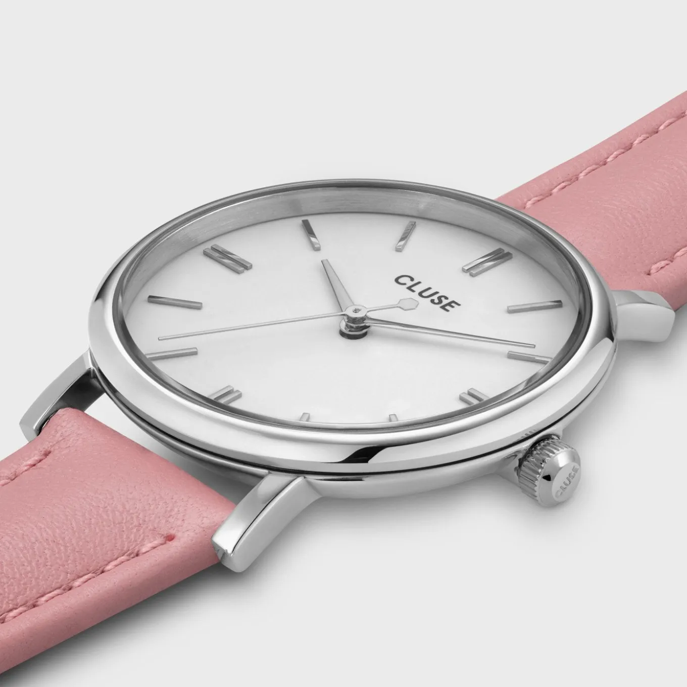 Die perfekte Kombination aus sportlich und stilvoll. Dieses filigrane Modell aus unserer Pavane Petite Collection in der Farbe Silber ist mit einem rosafarbenen Lederband ausgestattet und betont Ihre feminine Seite. Mit den zarten, abgerundeten Kanten ist sie das ideale Accessoire, um ein dezentes, aber modisches Statement zu setzen. Diese Uhr wird Sie auf all Ihren täglichen Abenteuern begleiten und von morgens bis abends Magie ausüben. Zum Kombinieren können die Armbänder dieses Modells mit allen 16 mm CLUSE-Uhrenarmbändern ausgetauscht werden.